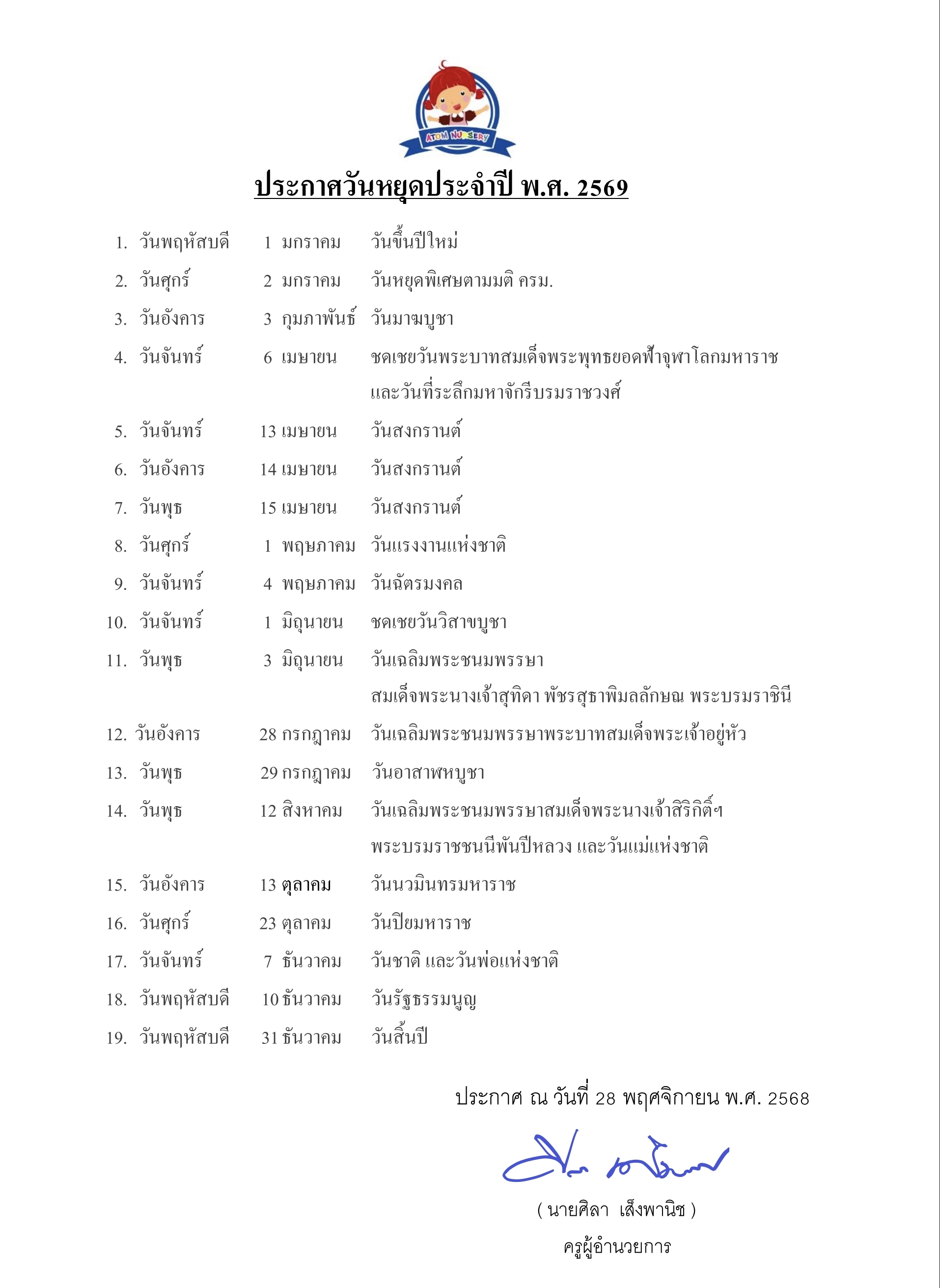 วันหยุดประจำปี พ.ศ. 2569 ของ อะตอม เนอสเซอรี่