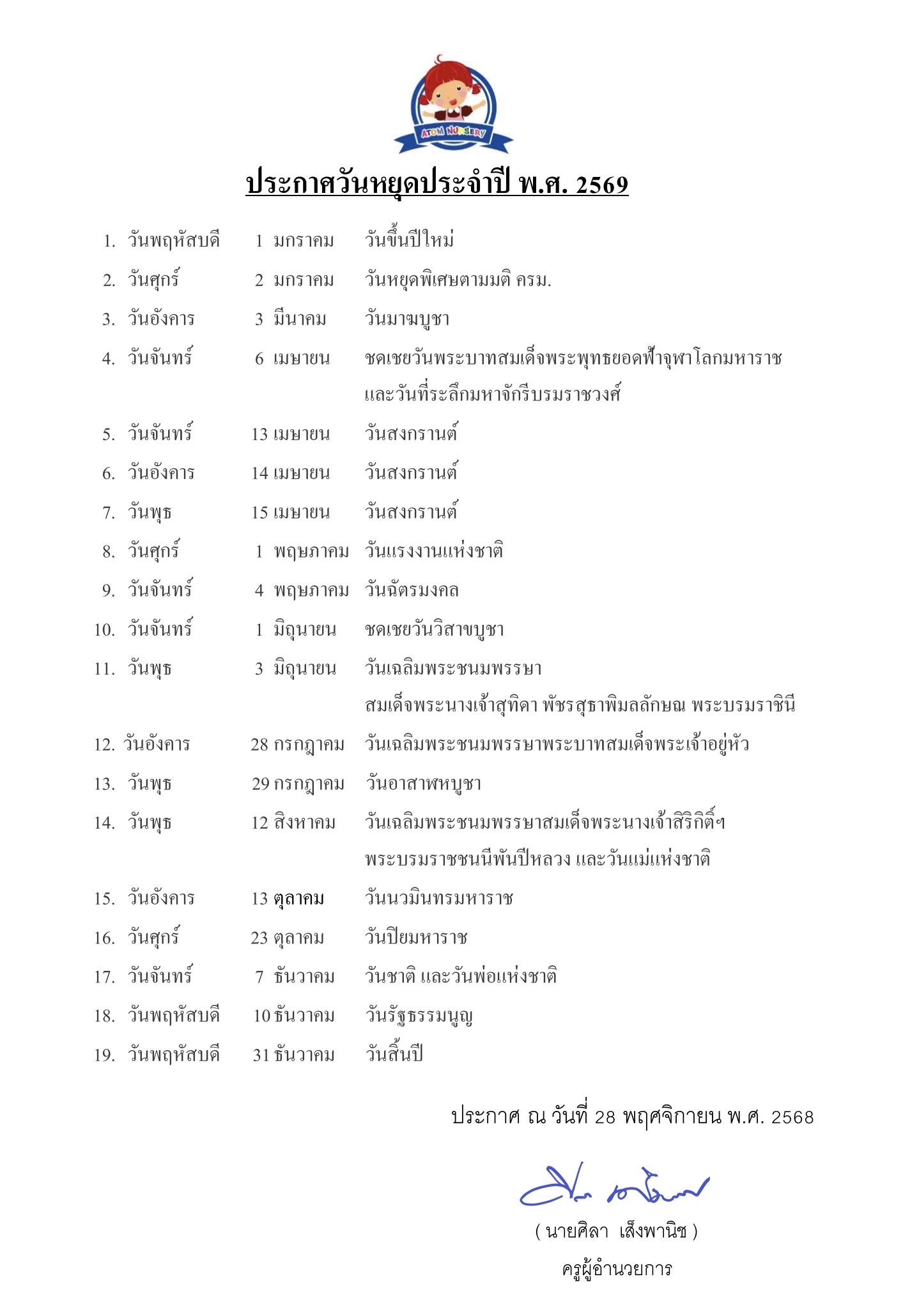 วันหยุดประจำปี พ.ศ. 2569 ของ อะตอม เนอสเซอรี่